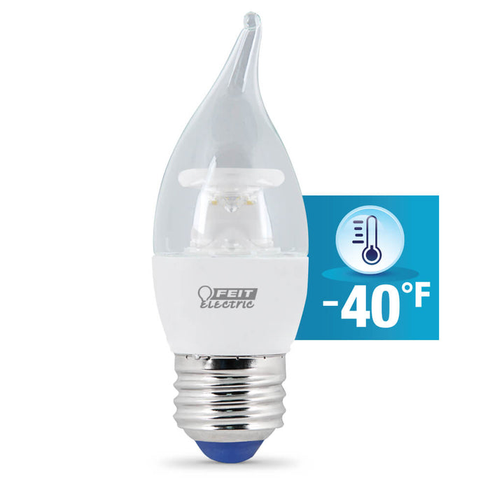 "Enjoy all the benefits of advanced LED energy-saving technology with the Feit Electric EFC/300/LED/COLD 40W ColdStart Flame Tip LED Light Bulb. This 3000K warm white light is dimmable and will replace a 40-watt equivalent incandescent bulb. It produces a similar light output (300 lumens), uses 4.8 watts of energy and up to 88% less energy than a standard incandescent light bulb. Get instant on to full brightness in sub-zero temperatures (-40F) with relatively cool running performance. Feit Electric Coldstart bulbs have an average life of 25,000 hours / 22.8 years are RoHS compliant and 100% mercury free. Choose a dependable accent and decorative bulb for residential or commercial applications."