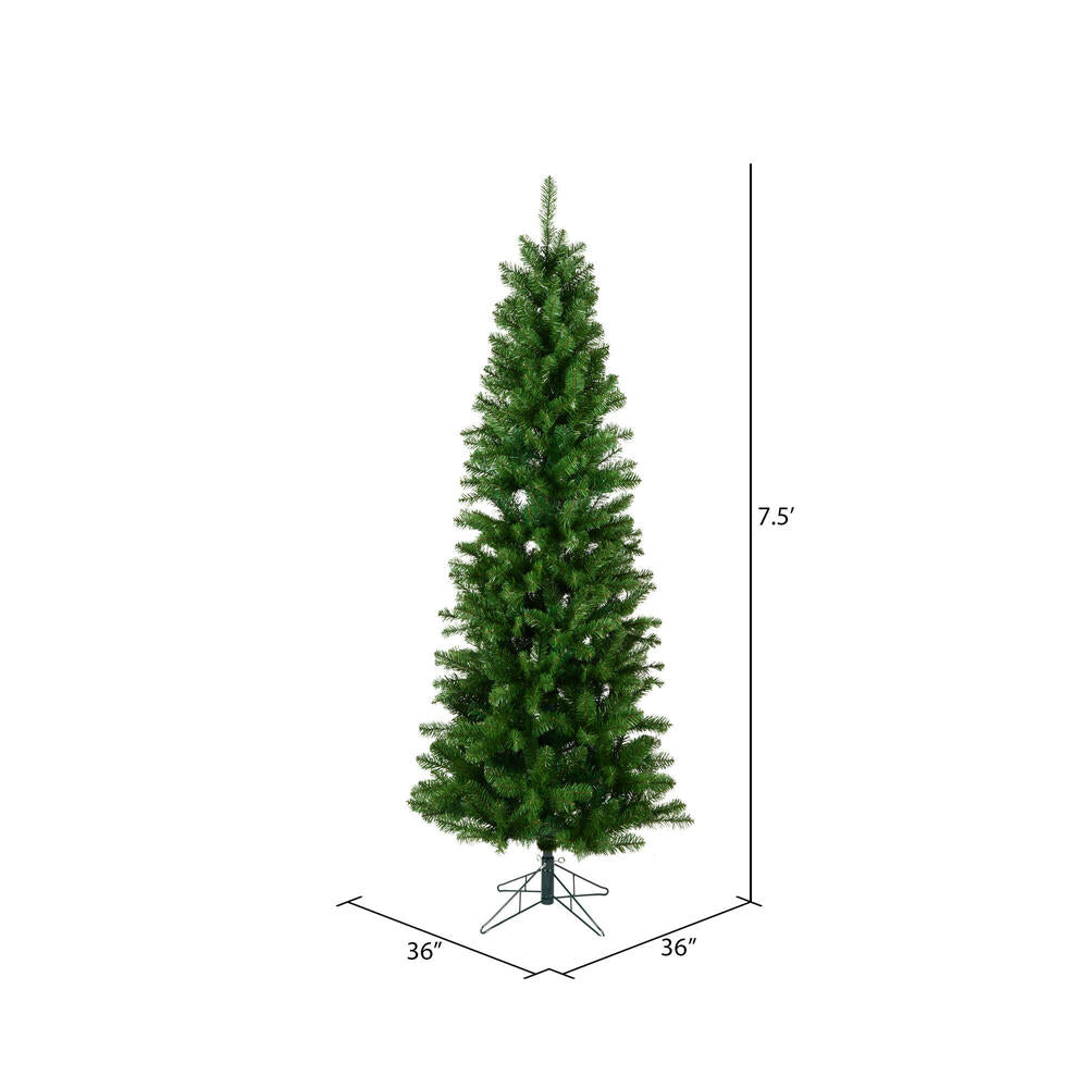 Vickerman 7.5' x 36" Salem Pencil Pine Artificial Christmas Tree featuring 757 PVC tips. I This tree is made with beautiful green PVC tips on metal hinged branches and Comes with a metal tree stand.