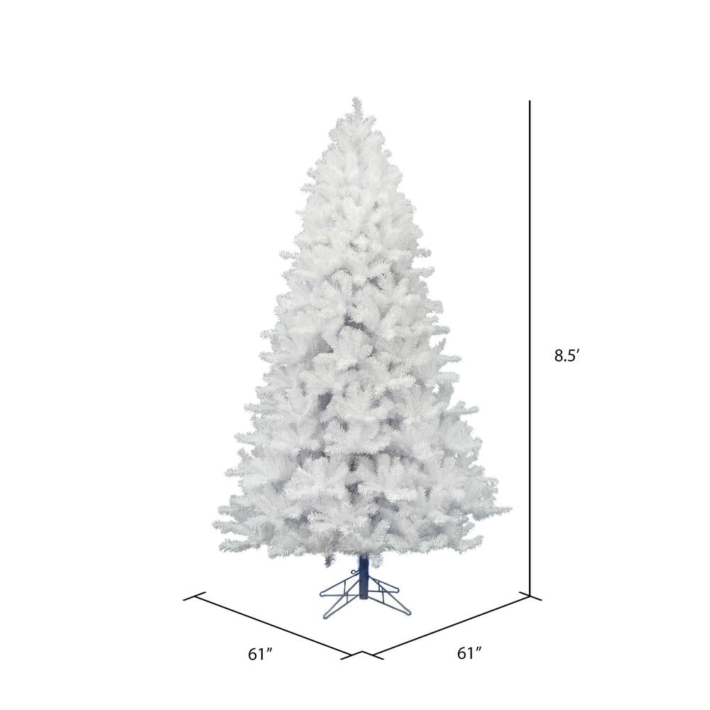 Vickerman 8.5' x 61" Crystal White Artificial Christmas Tree with 2481 PVC Tips. A wonderful alternative to the traditional green Christmas tree this brilliant tree comes unlit has white PVC tips on metal hinged branches and a metal tree stand is included.