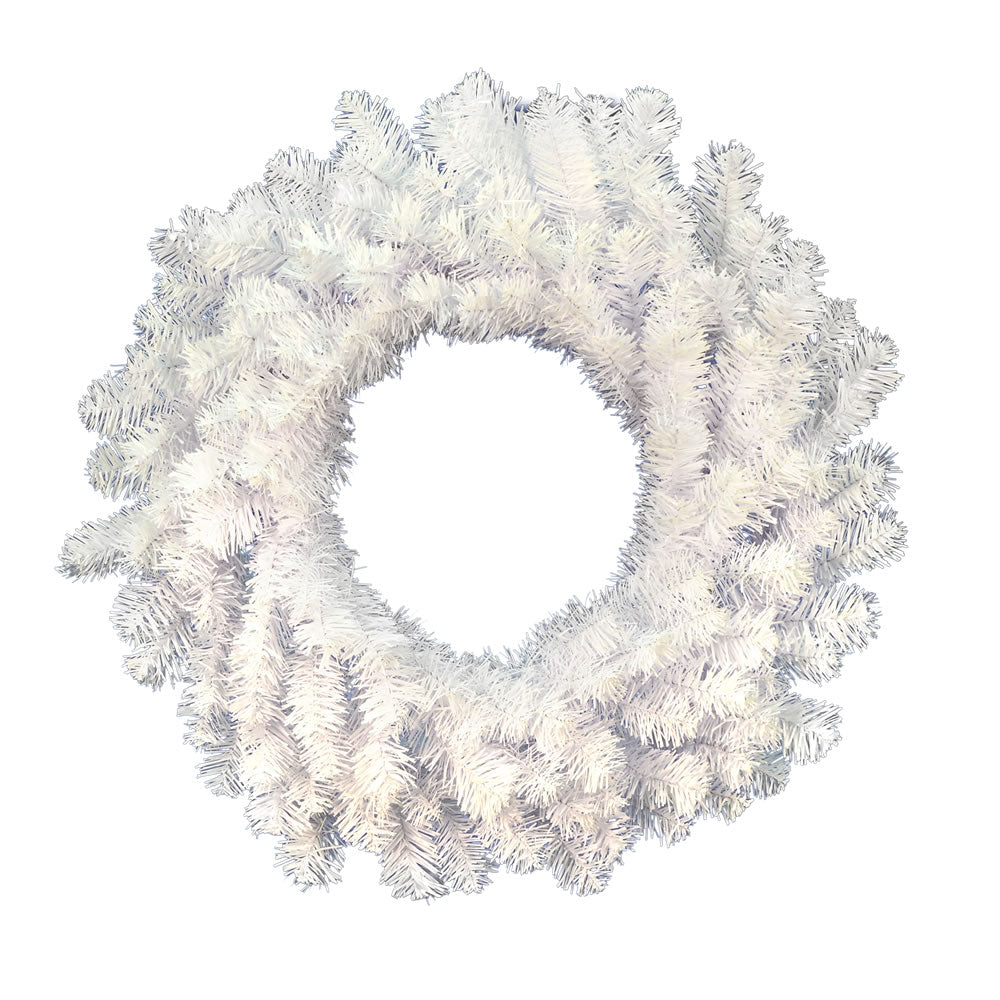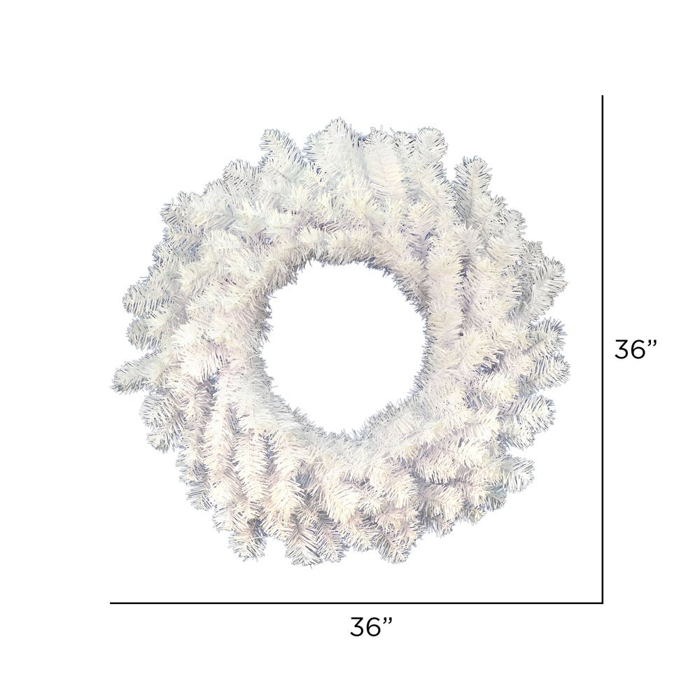 Vickerman 36" Crystal White Spruce Artificial Christmas wreath with 280 PVC Tips. Incorporate bright and modern holiday décor into your space with this beautiful white wreath. The white PVC tips feature a glossy finish for an eye-catching effect . A great holiday accent for your front door or mantle this wreath comes unlit and measures 36" across the diameter from the end of one tip to another.