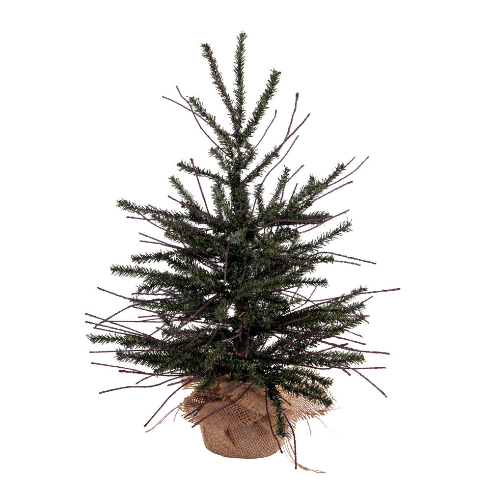 Vickerman 18" x 12" Vienna Twig Artificial Christmas Tree featuring 196 PVC tips. The perfect accent for any Holiday décor this great tree comes unlit is made with a blend of green PVC pine needles and twigs and is fixed in a decorative burlap base.