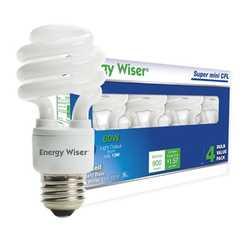 - Included in the box: 4- 13 watt Low Mercury Compact Fluorescent coil cool white