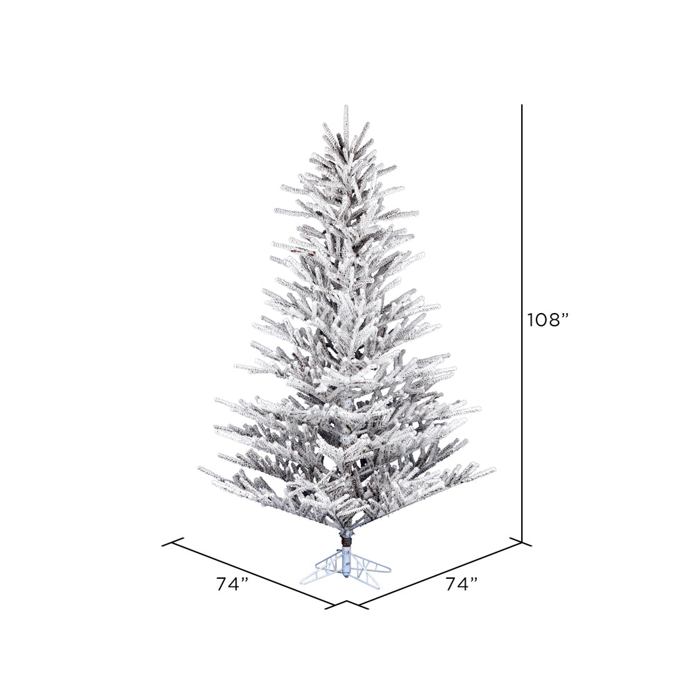 Vickerman 9' x 74" Flocked Stick Pine Artificial Christmas Tree with 1364 PVC Tips. This tree comes unlit features beautifully flocked PVC tips on metal hinged branches and a folding metal stand is included. Recommended for indoor use only.