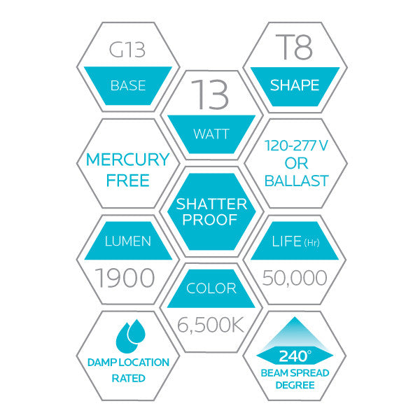 Luxrite LED 4' T8 Universal 13W Shatter Proof Ballast Compatible Light Tube, G13 Base, 1950 Lumens, 6500K - Daylight, 83 CRI, Frosted White Finish, Pack of 5 (LR34194)