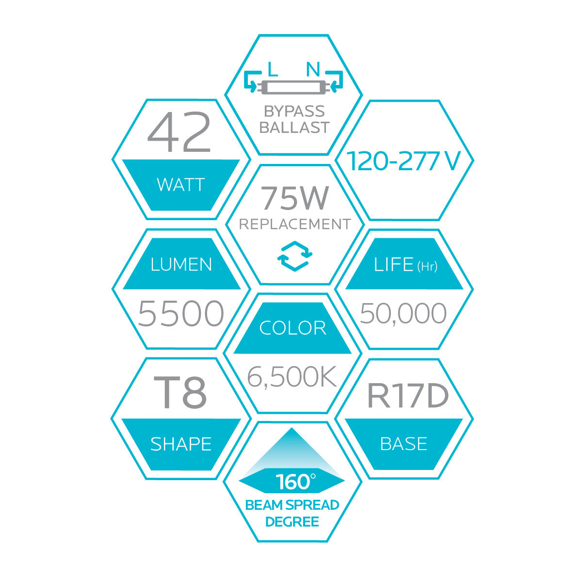 Luxrite LED 8' T8 Ballast Bypass Tube, R17D Base, 42W, 5500 Lumens, 6500K - Daylight, 82 CRI, Frosted White Finish, Pack of 2 (LR34137)
