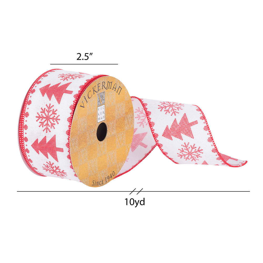 Vickerman 2.5" x 10 Yards White and Red Tree Snowflake Wired Edge Christmas Ribbon. Add this Beautiful Ribbon to any arrangement holiday tree or as a stylish accent to your gift wrapping projects. This ribbon is made of polyester and features a wired edge that allows bending and shaping for easy decorating.