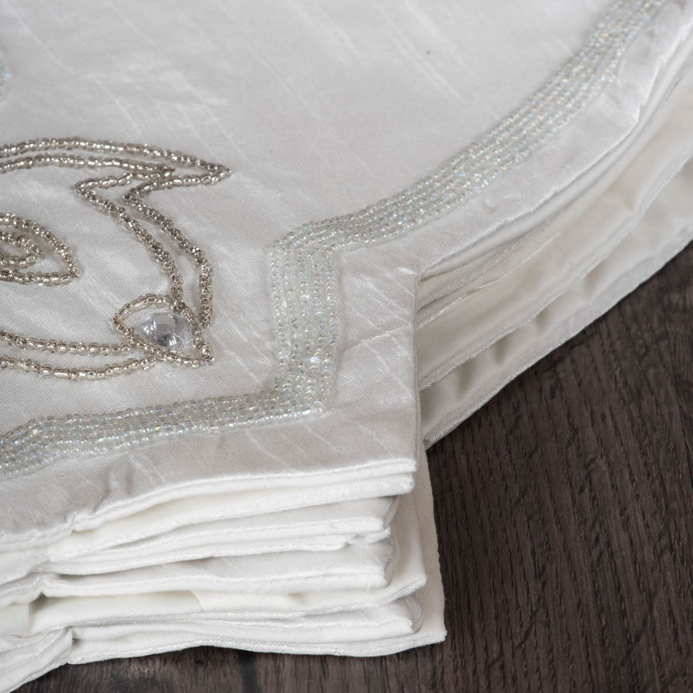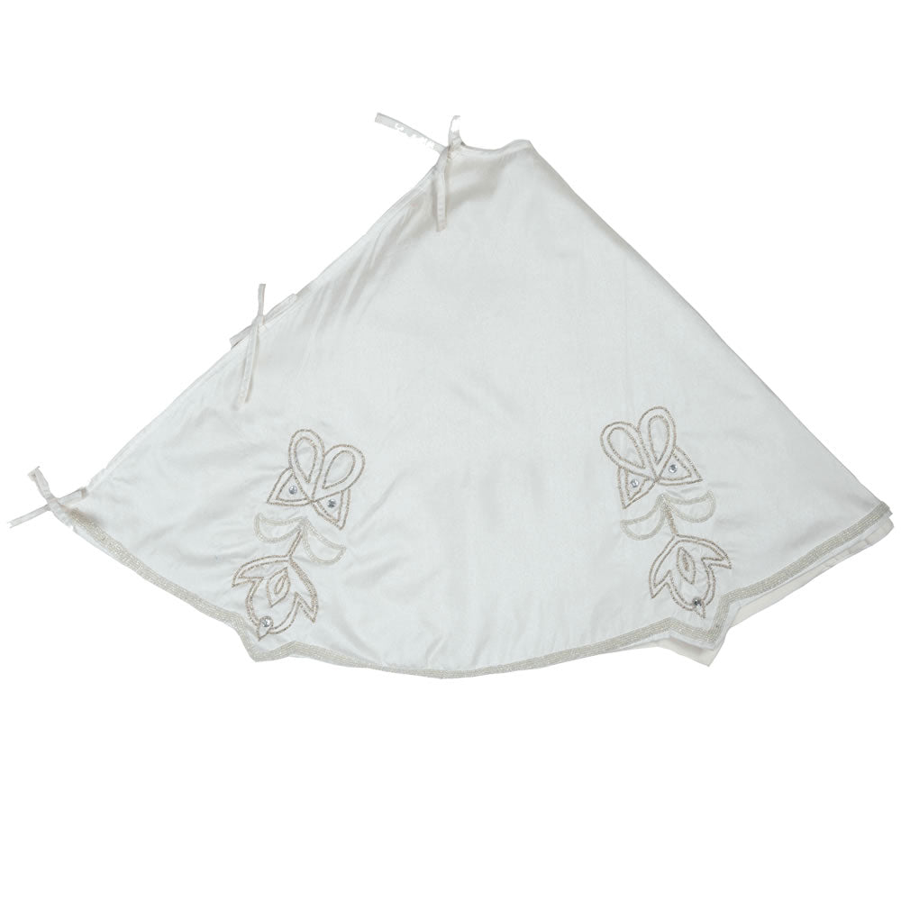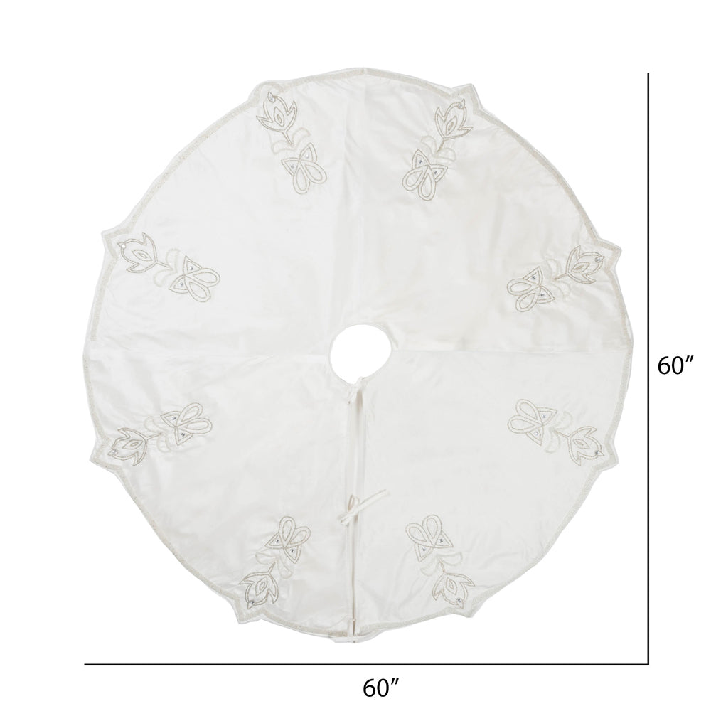 Vickerman Decorative 60" Pointed Beaded Tree Skirt. The perfect finishing touch for any Christmas tree this gorgeous tree skirt features Luxurious Pure White Polysilk Dupioni With Silver And Crystal Beaded Accents; it's Fully Lined; has a Tie Closure and measures 60" in diameter.