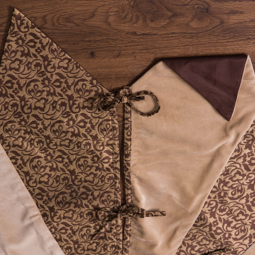 Vickerman Decorative 60" Brocade Brilliance Christmas Tree Skirt. The perfect finishing touch for any Christmas tree this gorgeous tree skirt features Elegant Woven Brocade And Plush Velvet Pieced Tree skirt With Pointed Hem; it's Fully Lined; has a Tie Closure and measures 60" in diameter.