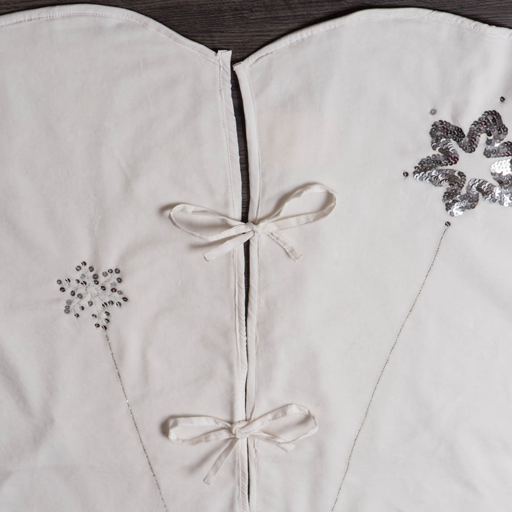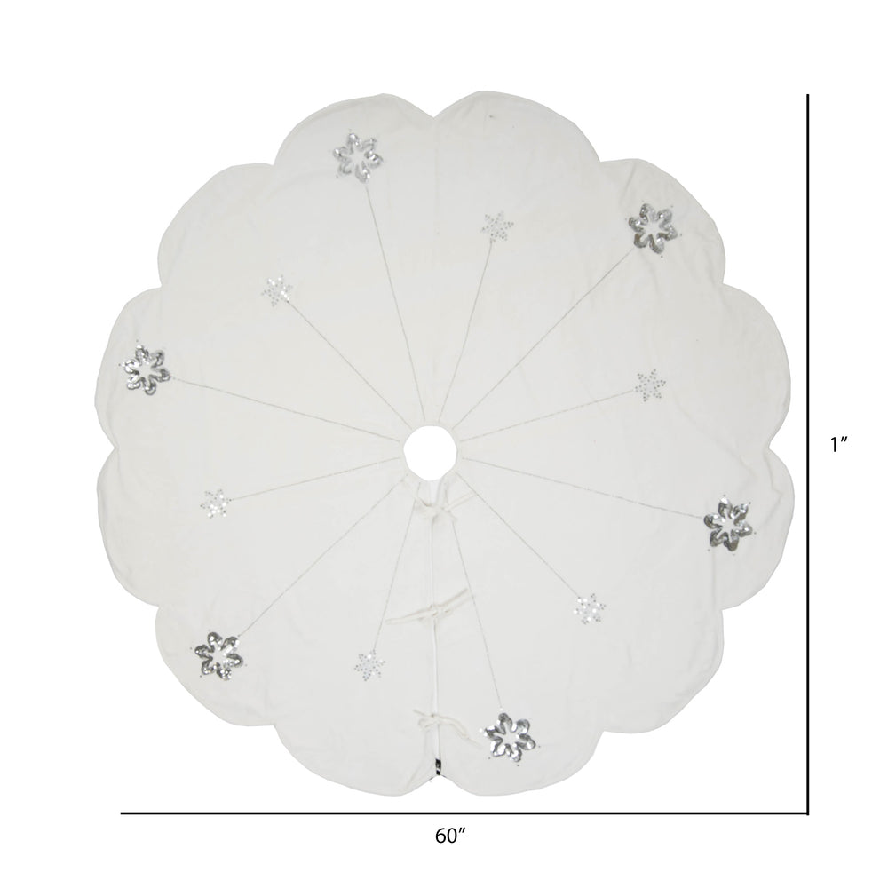 Vickerman Decorative 60" Silver Flakes Collection Christmas Tree Skirt. The perfect finishing touch for any Christmas tree this beautiful tree skirt features Elegant And Plush White Cotton Velvet With Silver Sequin And Embroidery Motif; Scallop Hem; it's Fully Lined; has a Tie Closure and measures 60" in diameter.