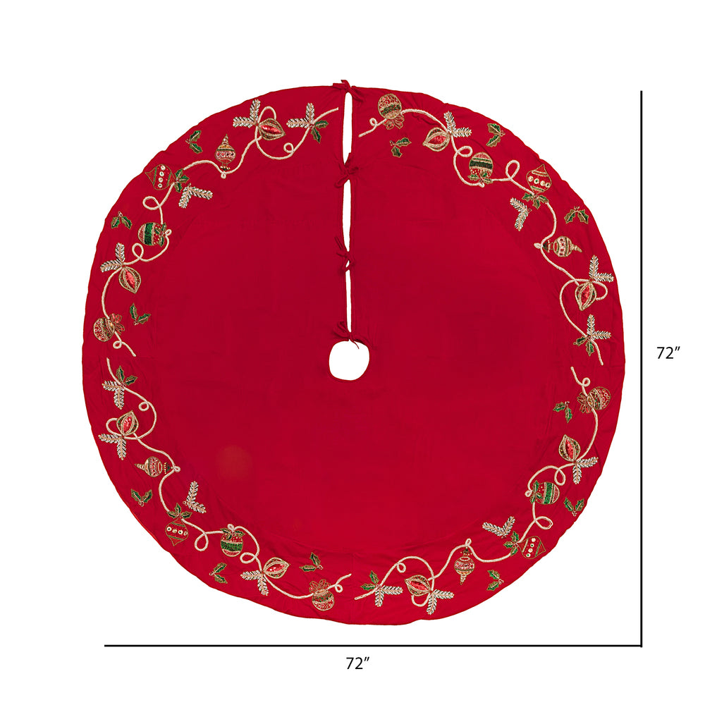 Vickerman 72" Red Beaded Ornament Velvet Christmas Tree skirt. This one of a kind holiday tree skirt features red velvet fabric adorned with hand beaded jewels sequins and pearls. The intricate details on this tree skirt glow and sparkle in the warm holiday lights. This skirt features a full fabric underlay and fabric tie closures. This tree skirt measures 72 inches in diameter which makes it the perfect fit for the most grand sized trees.
