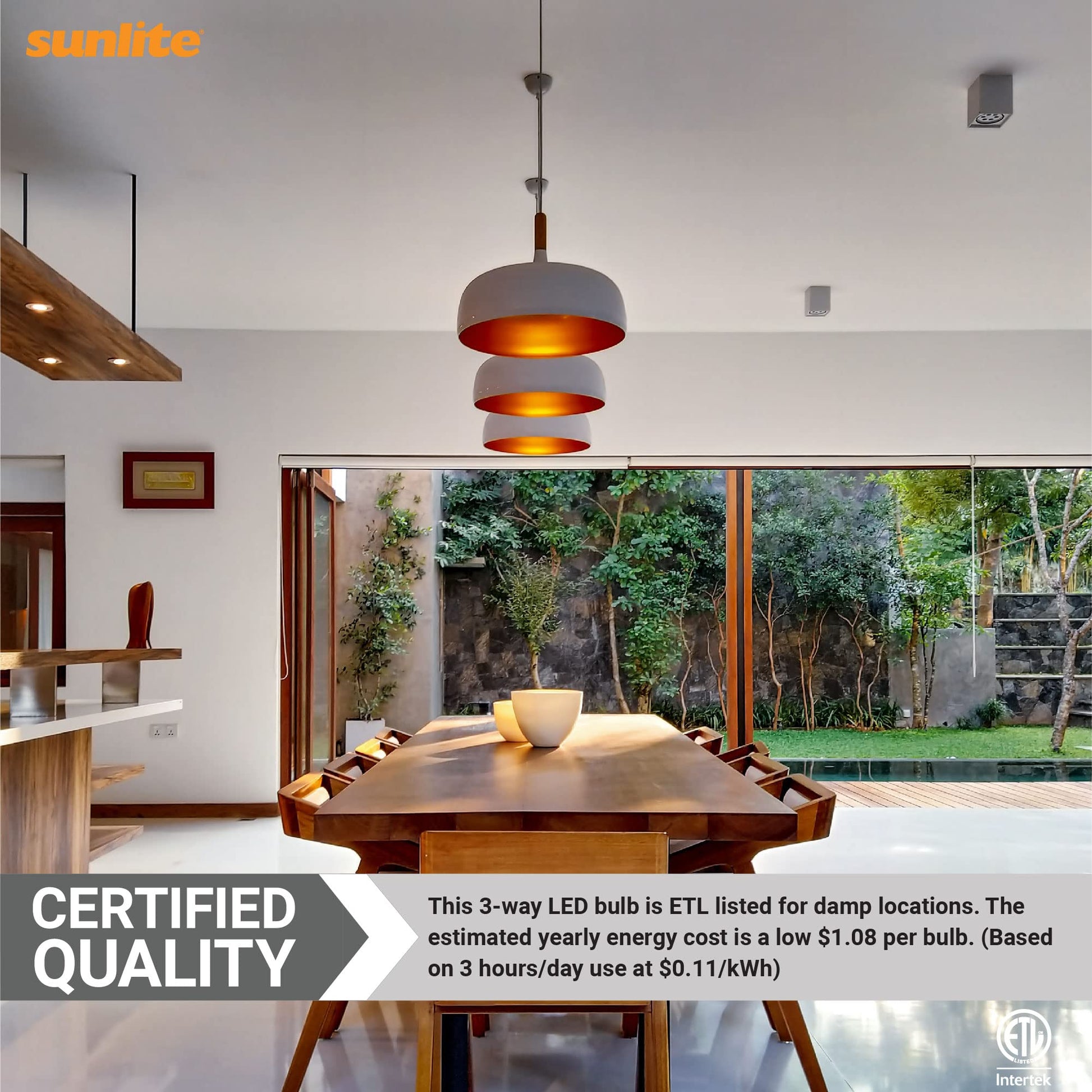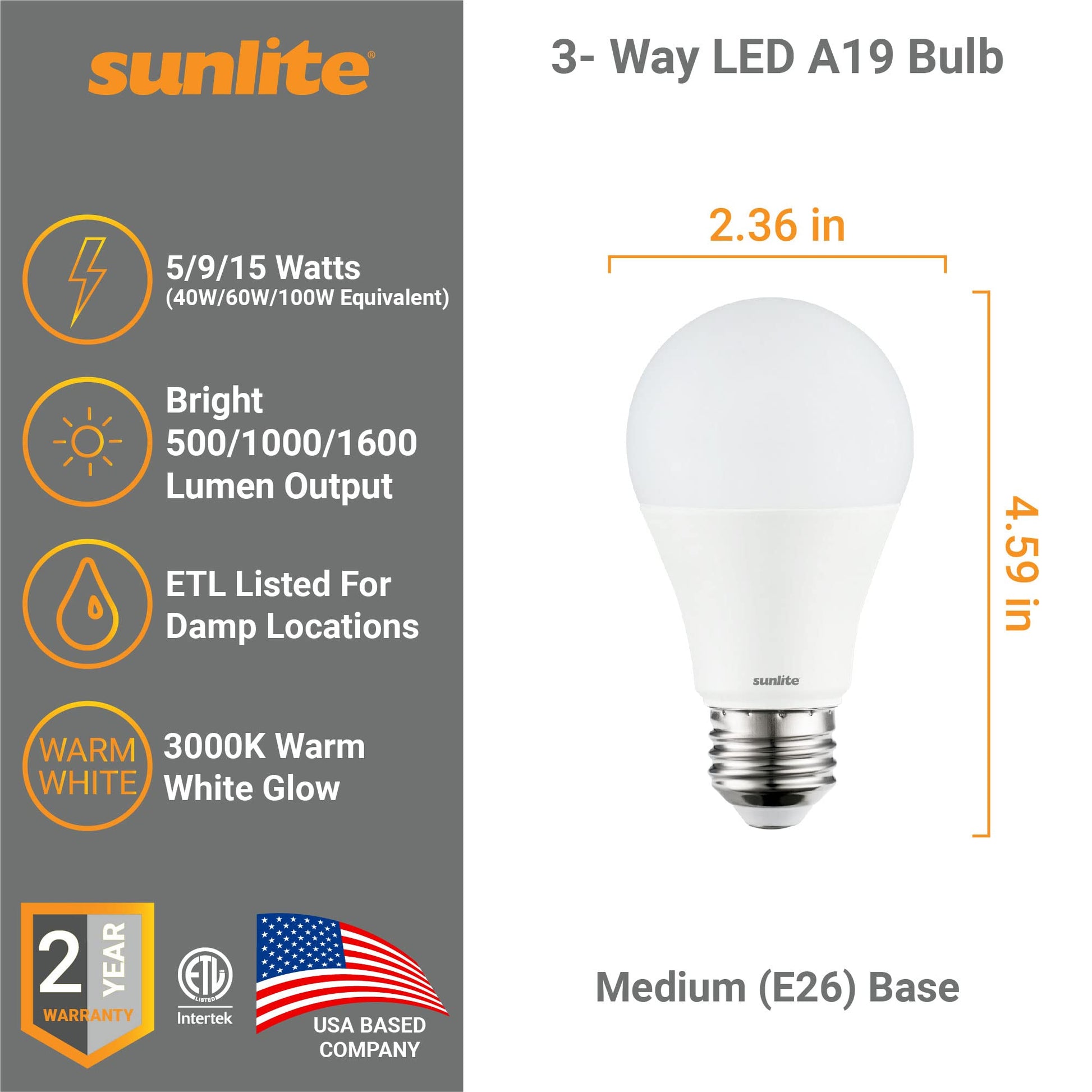 Sunlite 70323 3-Way LED A19 Light Bulb, 5/9/15 Watts (40W 60W 100W Equivalent), 500-1000-1600 Lumens, Medium E26 Base, Omni-Directional, ETL Listed, Frost, 3000K Warm White, 6 Count