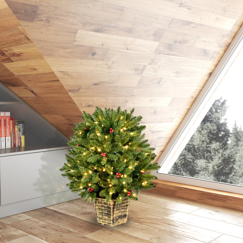 Vickerman 2.5' x 28" Potted Tifton Globe Artificial Christmas Tree with 295 PVC Tips and 100 UL Dura-Lit® LED Warm White Mini Lights. Incorporate this beautiful tree into your space it comes prelit with Warm White Dura-Lit LED Mini Lights features PVC Tips with red berry accents on pull down branches and is fixed in a plastic weighted container.