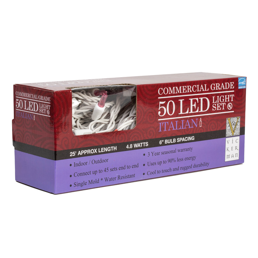 Vickerman 25' Magenta Single Mold Italian LED Christmas light set. Add some sparkle to your Holidays with this light strand featuring 50 Magenta Single Mold Italian LED lights on white wire with 6" spacing between bulbs. This light set is end connecting and has the ability to connect to as many as 45 sets. 4.8 watts .04 Amps. Color box packaging.