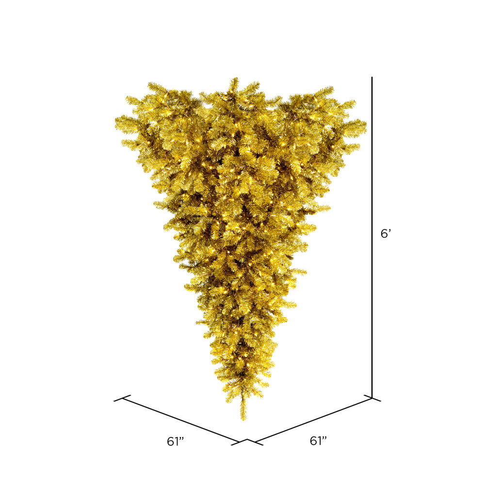 Vickerman 6' x 61" Champagne Upside Down Artificial Christmas Tree with 1372 PVC Tips and 600 Warm White Italian LED Lights. This unique tree is designed to be hung from the ceiling leaving plenty of room for gifts to be placed underneath. It comes prelit with Warm White Dura-lit LED Mini Lights features beautiful PVC tips on metal hinged branches and a decorative hanging chain is included.