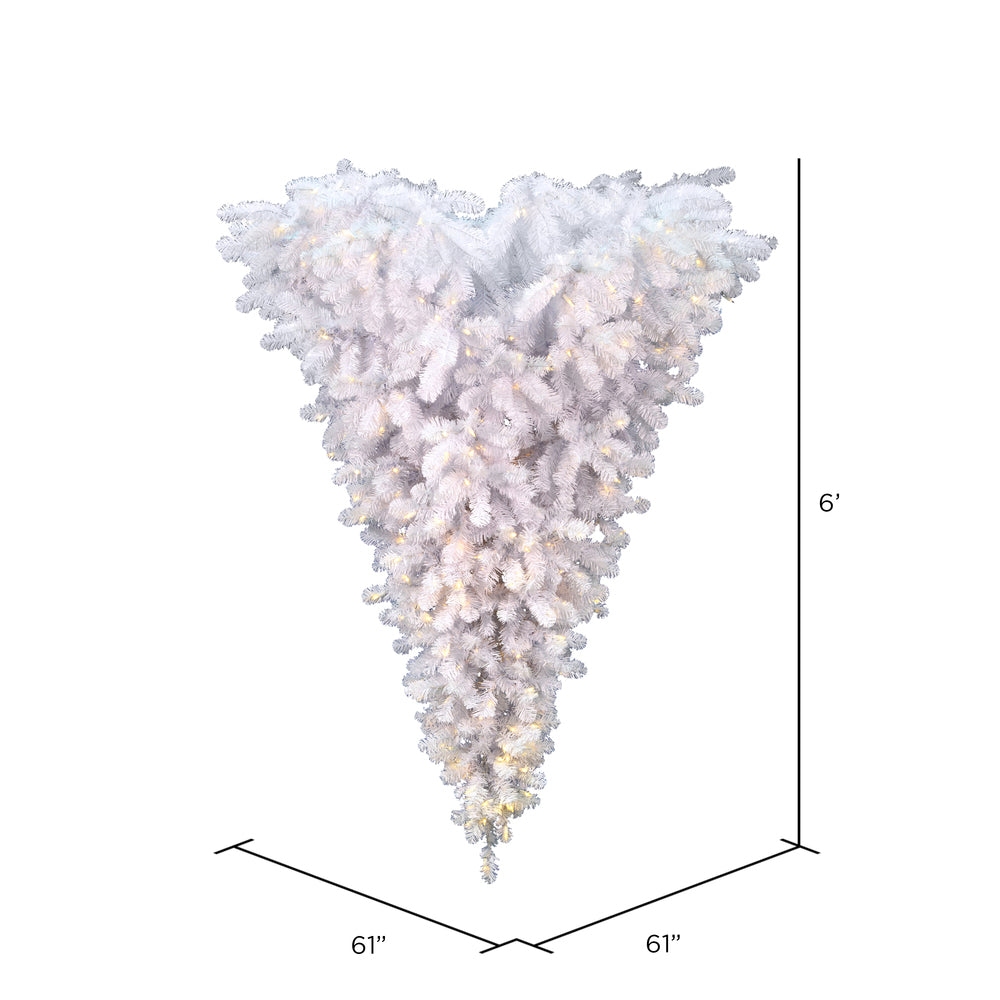 Vickerman 6' x 61" White Upside Down Artificial Christmas Tree with 1372 PVC Tips and 600 Pure White Single Mold LED Lights. This unique tree is designed to be hung from the ceiling leaving plenty of room for gifts to be placed underneath. It comes prelit with Pure White LED Italian Mini Lights features beautiful PVC tips on metal hinged branches and a decorative hanging chain is included.